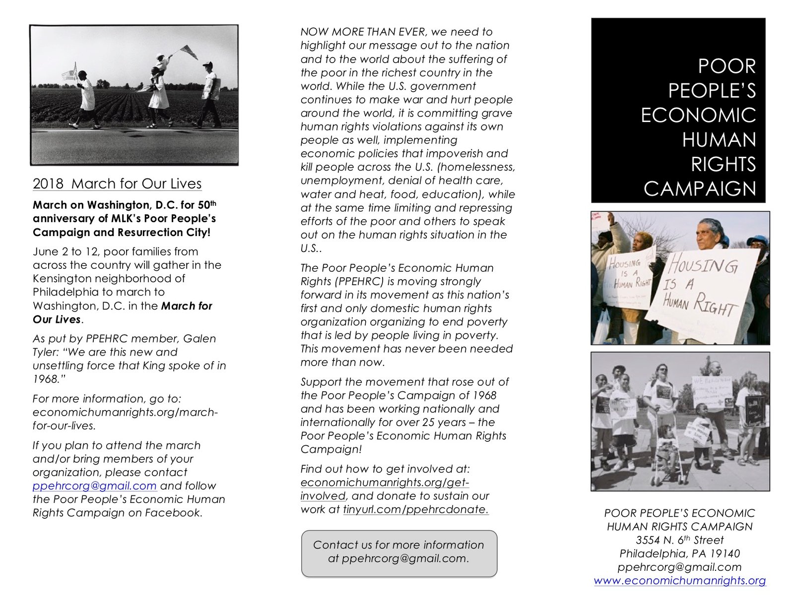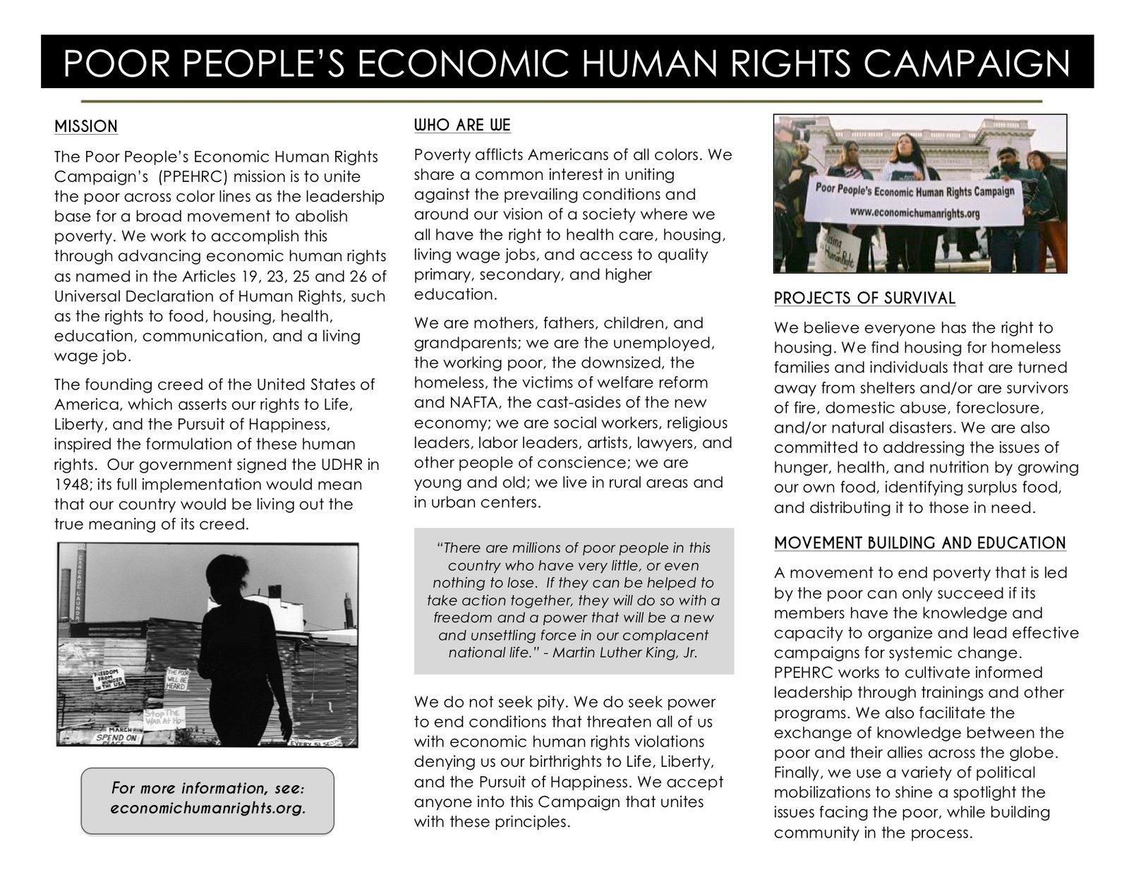 The Poor People’s Economic Human Rights Campaign includes people of many backgrounds. We are mothers, fathers, children, and grandparents; we are the unemployed, the working poor, the downsized, the homeless, the victims of welfare reform and NAFTA, the cast-asides of the new economy; we are social workers, religious leaders, labor leaders, artists, lawyers, and other people of conscience; we are young and old; we live in rural areas and in urban centers.